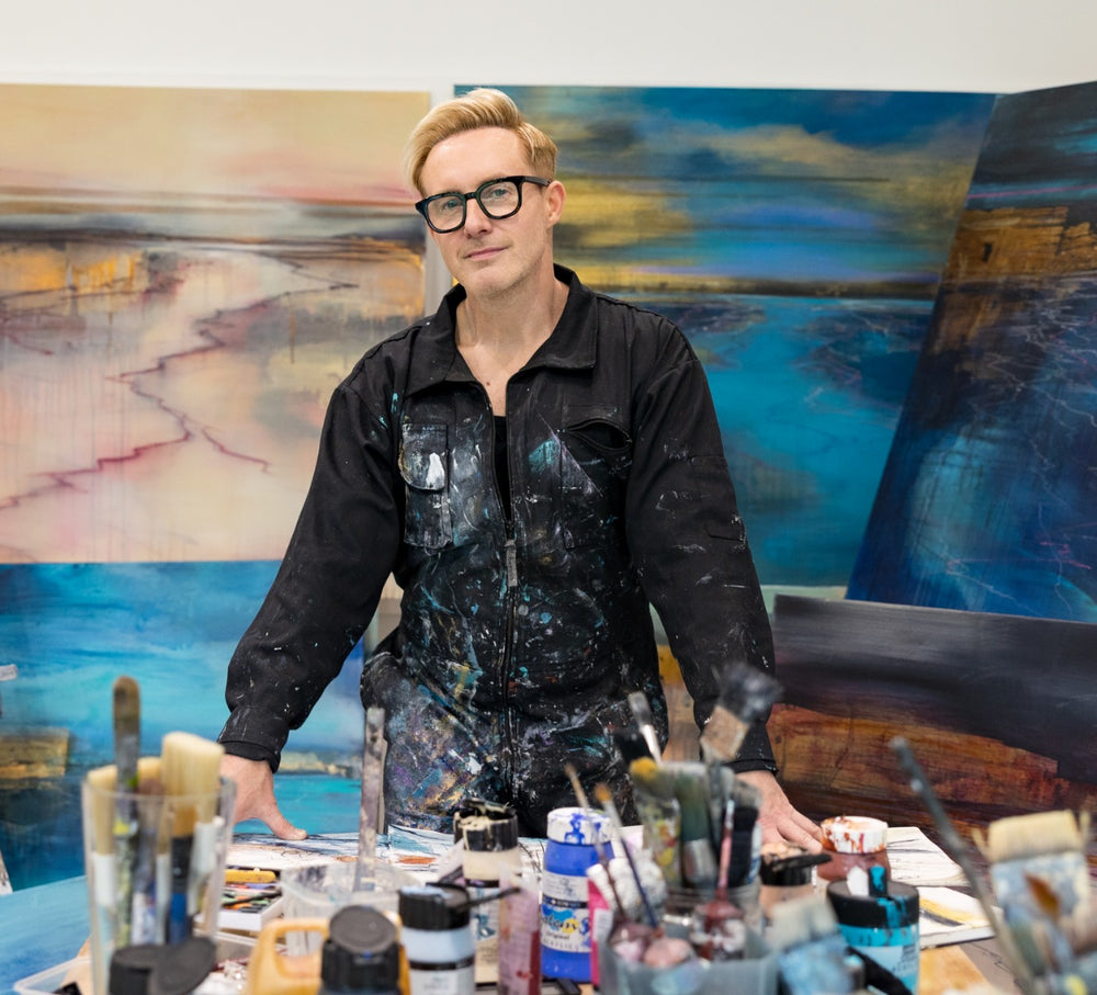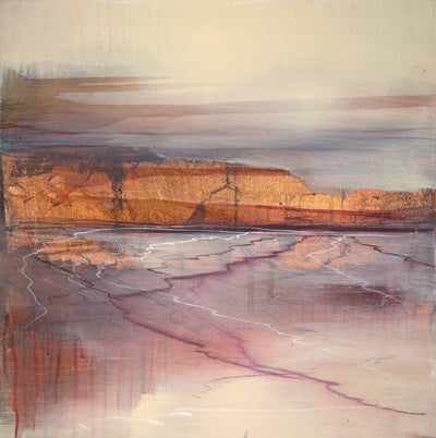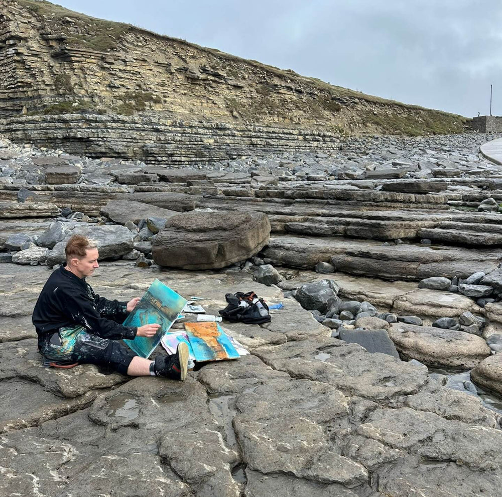 Working primarily in acrylic, layered with pastel, charcoal, and touches of gold leaf, Watkins paints with energy and intuition. Often working on location, he gathers sand or soil to mix into his surfaces, creating pieces that are a literal extension of the land itself. The result is a raw, tactile aesthetic that mirrors the rugged beauty of cliffs, coastlines, and valleys, while evoking the atmosphere and emotion of place.