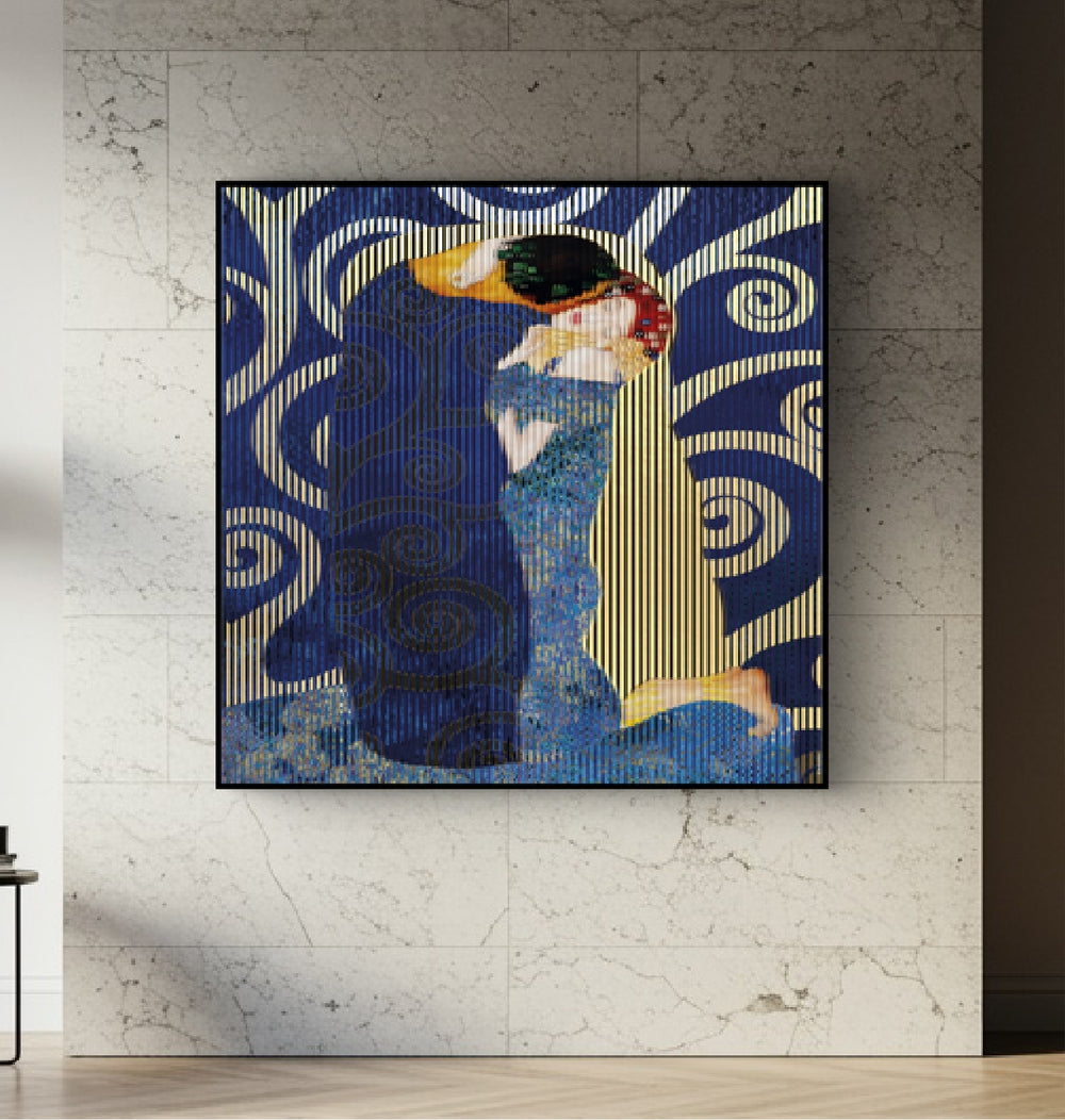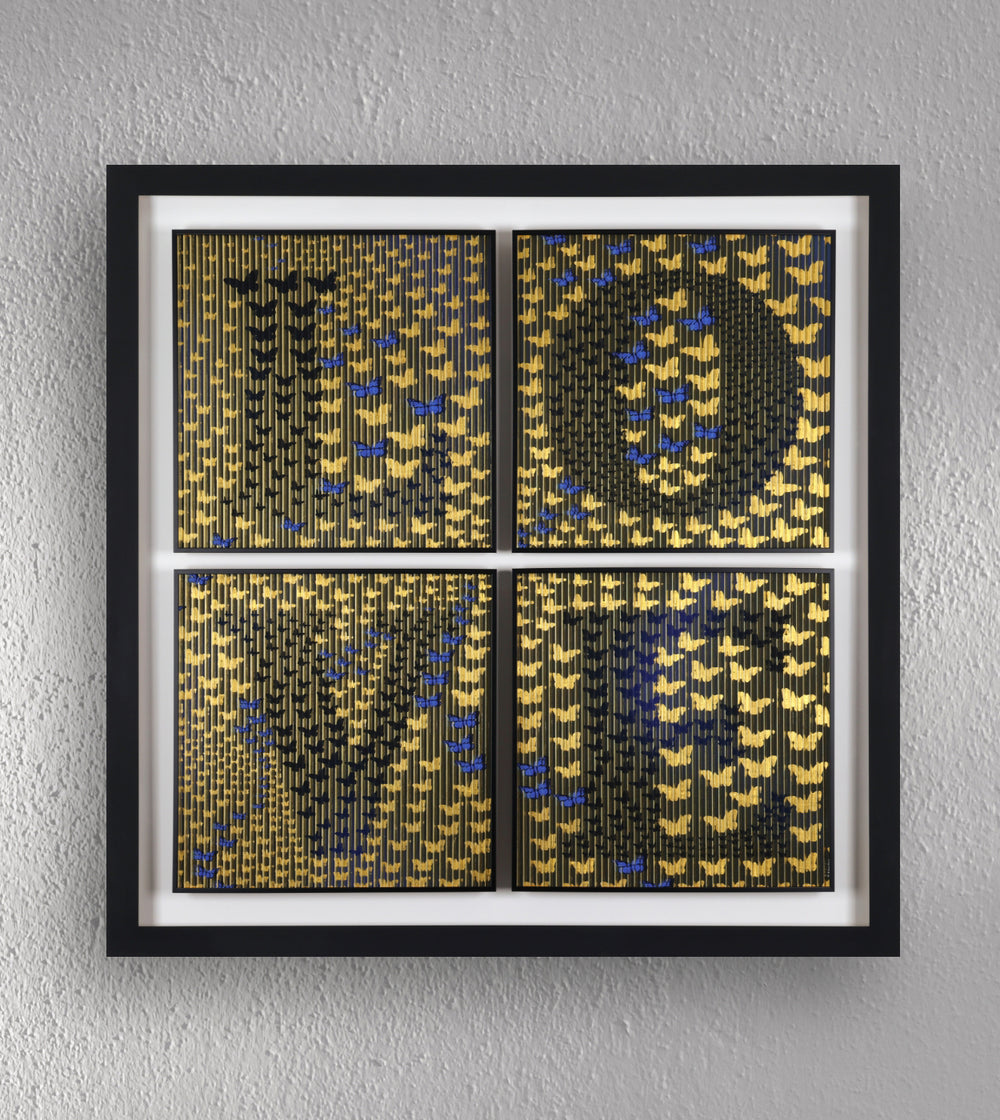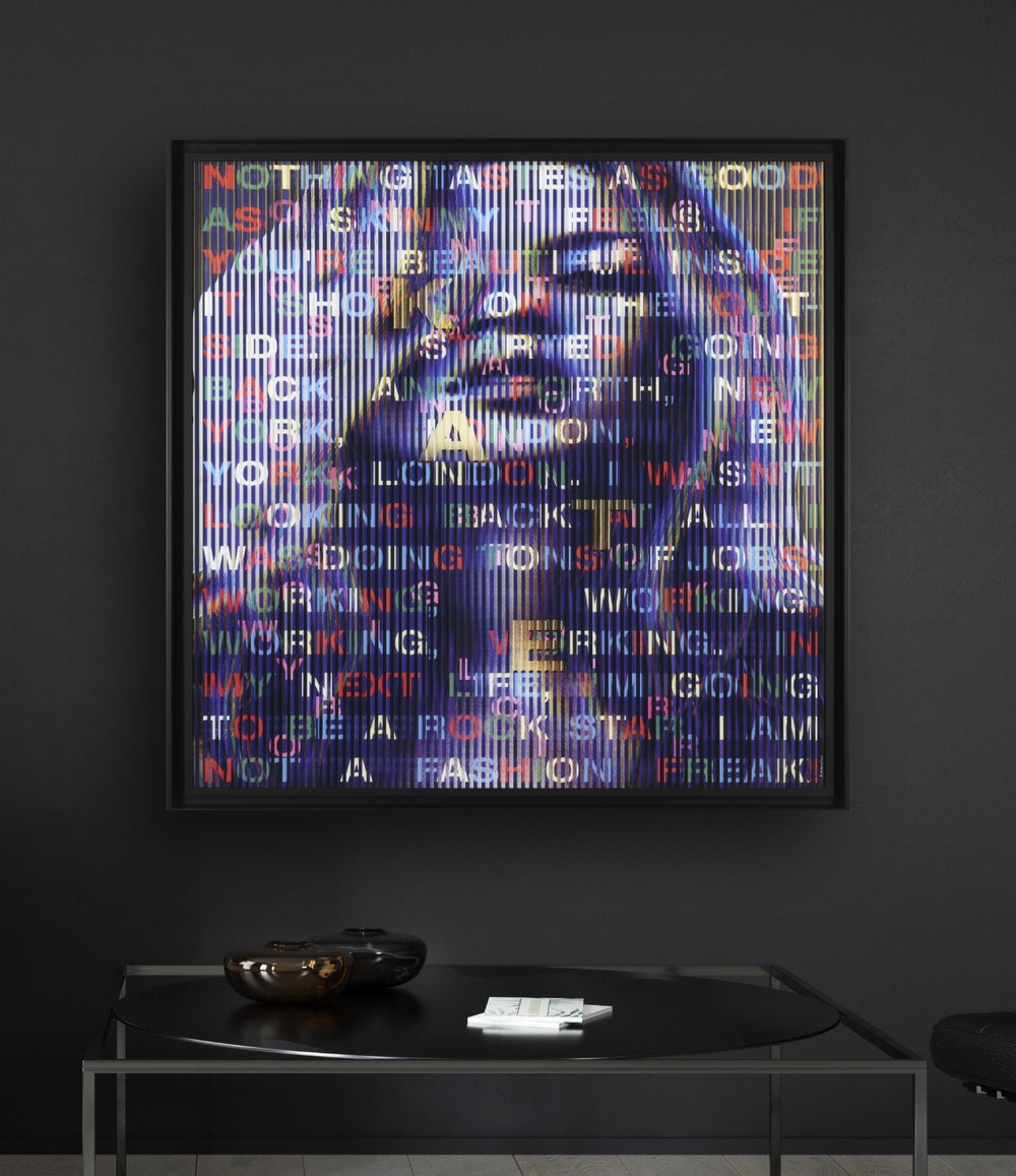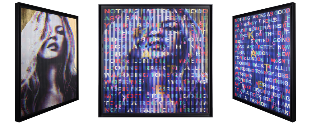 His avant-garde technique is not digital, but uses layering and angling to create the ‘kinetic’ effect, allowing visual variations when the spectator moves around the work. The viewer can therefore change what they see, and decide on the speed, the angles and the approach, so every interactive viewing experience is personal and unique.