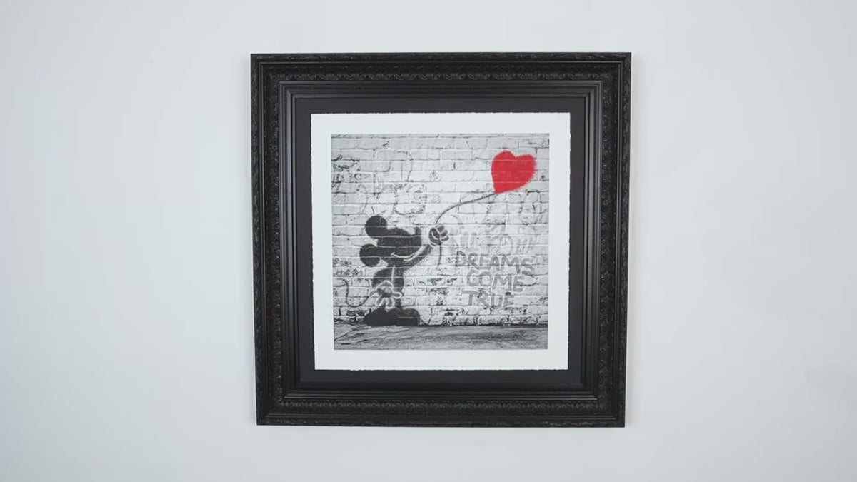 ‘Dreams Come True’ (Deluxe) is a framed silkscreen on paper edition by global Pop art phenomenon Mr Brainwash, released as part of his official collaboration with Disney. Measuring 26 x 26” and released as a limited edition of 95, this striking monochrome artwork features Mickey Mouse painted holding bright red heart balloon on a graffiti-covered wall. Combining street art edge with nostalgic Disney charm, it’s a powerful symbol of hope, creativity and imagination triumphing over the everyday. Size:38 x 38 in.