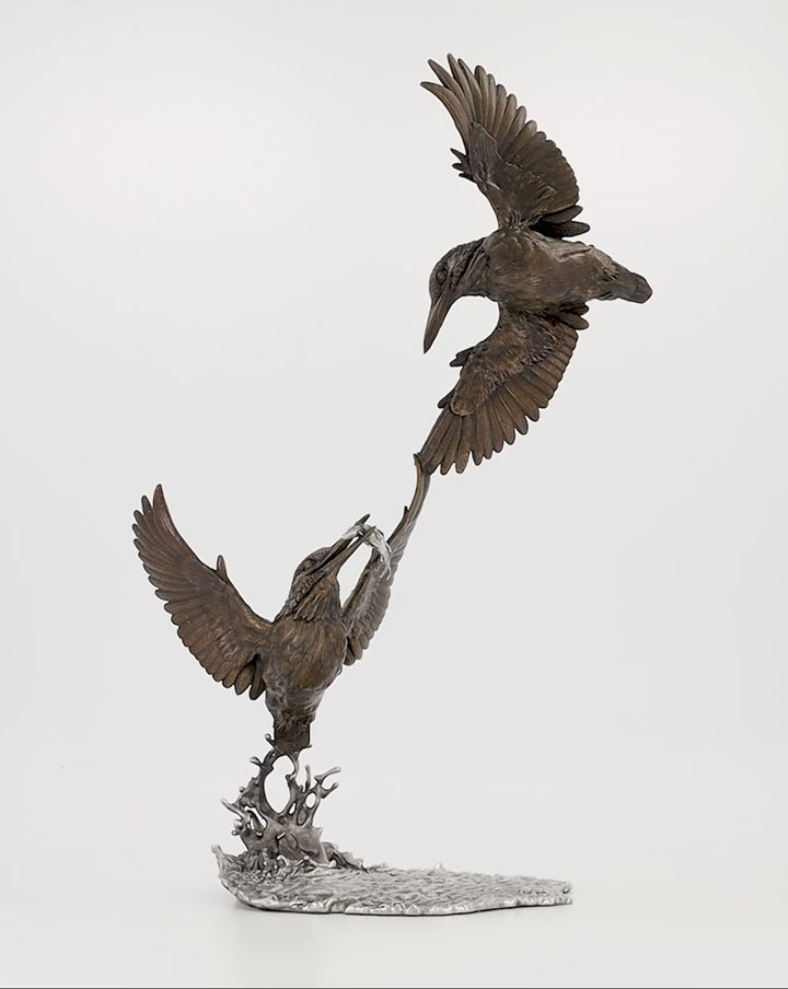 ‘First Prize’ is a sculpture in bronze and stainless steel by contemporary British artist Dean Kendrick, released as part of his debut collection with Clarendon Fine Art. This beautifully crafted work depicts two kingfishers eagerly vying for the morning’s finest catch, a gleaming silver fish. This artwork measures 12 x 20” and is available as a limited edition of 195.