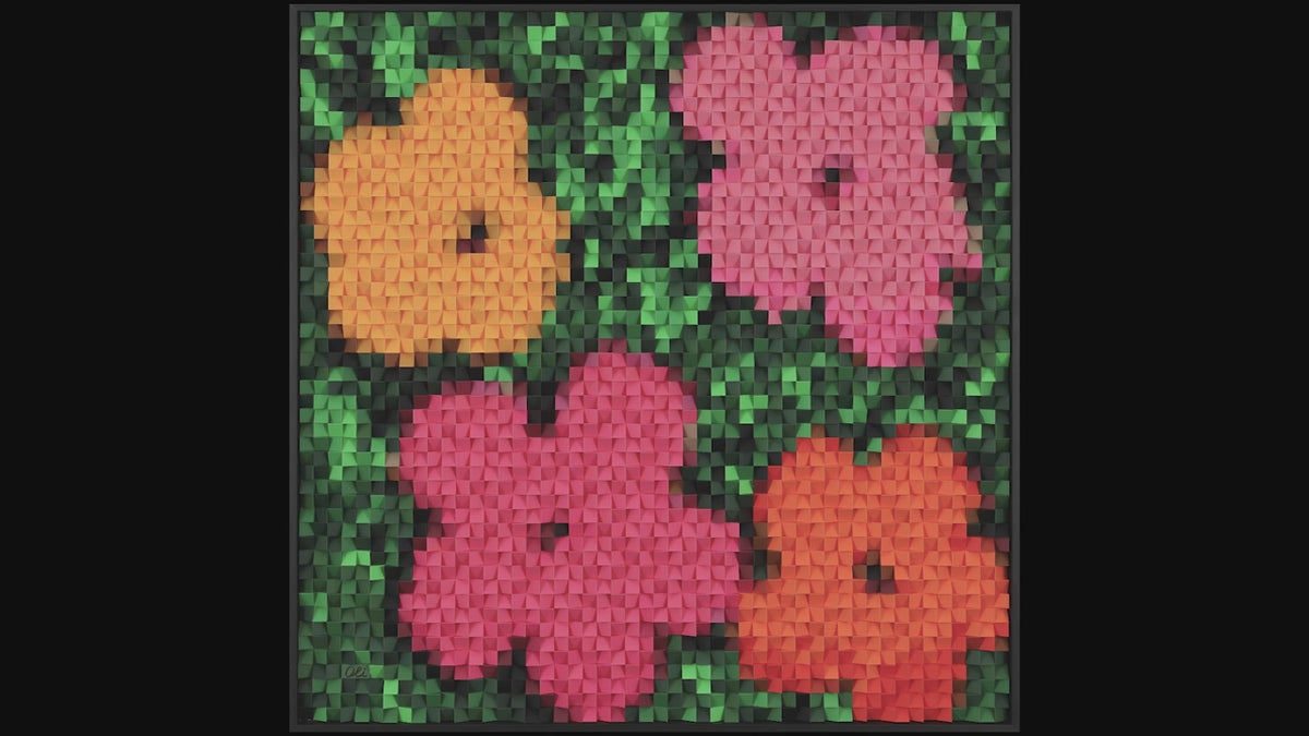 Oli Arshinov’s Flowers (40" x 40") is a radiant exploration of colour, memory and form, transforming a familiar subject into something wholly contemporary. At first glance, the composition recalls the iconic floral motifs of Pop Art, yet Oli reinvents the imagery through her unique sculptural-painting technique. Hundreds of hand-painted cubes are meticulously mounted onto a brushed aluminium surface, each one angled and shaded to create shifting tones and textures. From a distance, the work resolves into four bold blossoms in vivid pinks and oranges against a richly textured green ground. Up close, the surface dissolves into a tactile mosaic of miniature planes, each carrying its own tonal nuance.