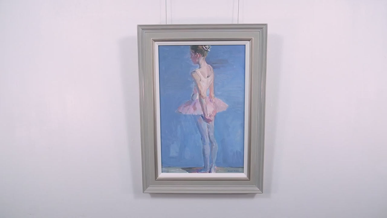 Young Ballerina (16" x 24") by Valeriy Gridnev is a tender and contemplative portrait of a young dancer poised in stillness. Set against a soft, painterly backdrop of cool blue, the figure emerges with grace and subtle energy. The ballerina, standing with her back slightly turned, holds her hands gently behind her as though awaiting instruction or preparing herself mentally for the dance ahead. Her pink tutu and delicate posture contrast beautifully with the serene cool tones of the background, evoking a quiet sense of anticipation.